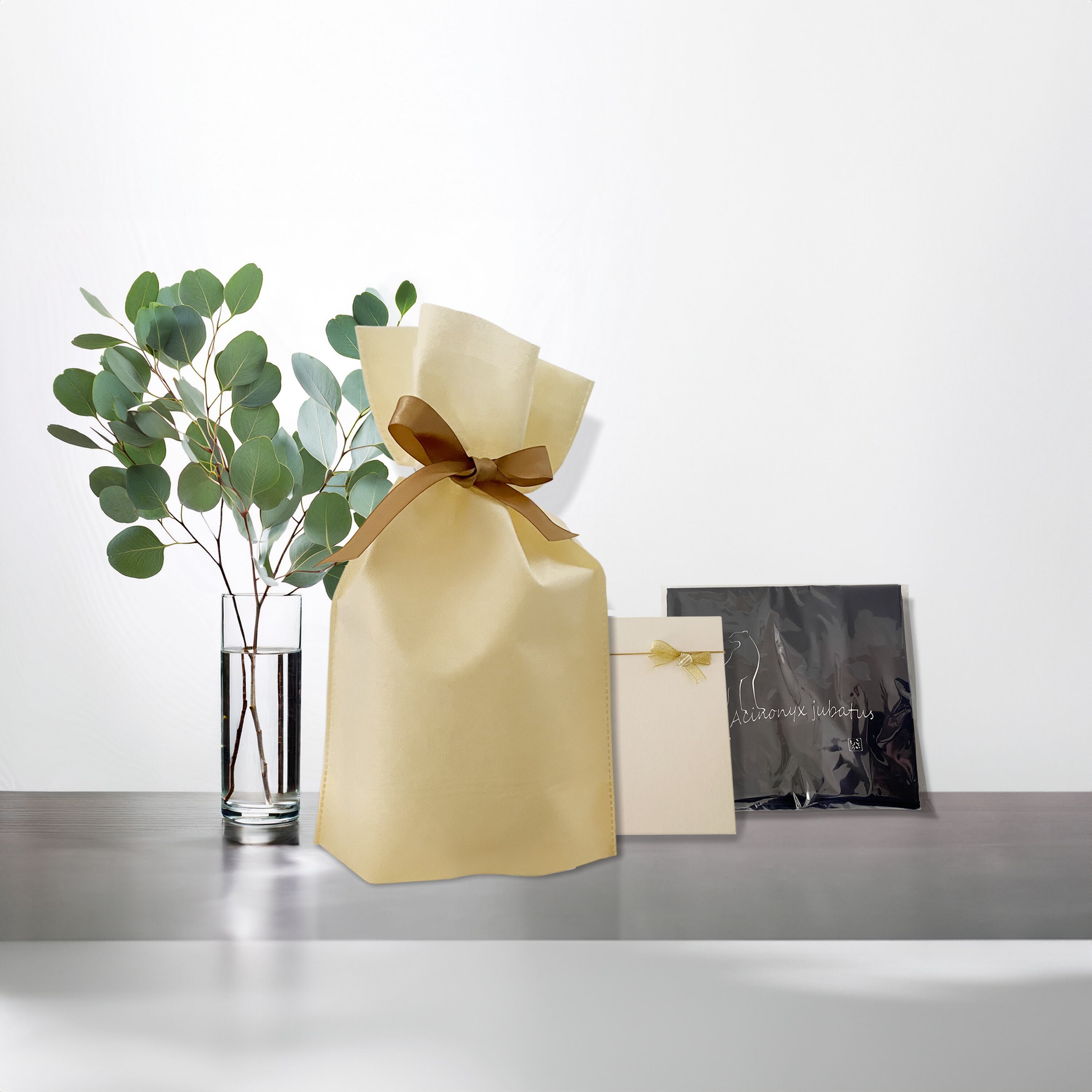 ギフト用にクリーム色の二重不織布の巾着袋とメッセージカード